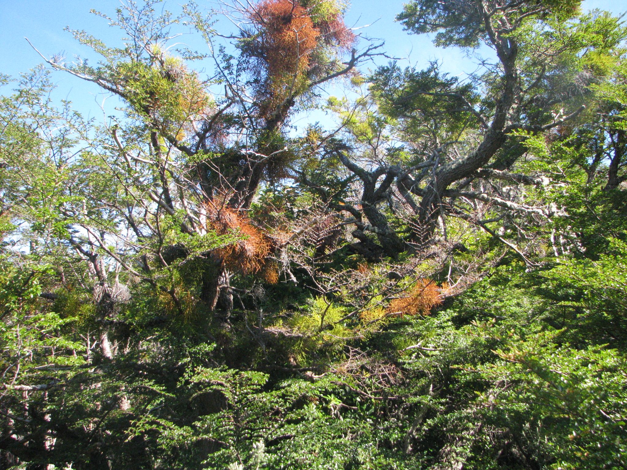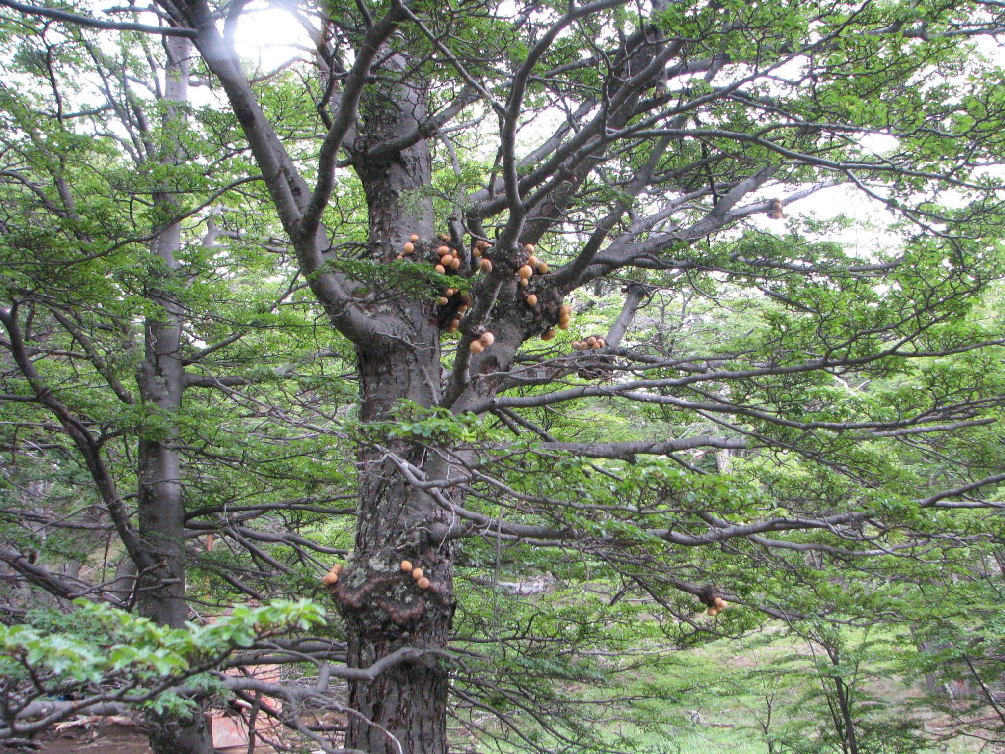 Le champignon, Cyttaria darwinii est fréquent sur les troncs et les branches, et fait en ce moment de belles fructifications jaunes (pan de los Indios), et qui contient des larves de diptère. L’arbre ne meurt pas et se défend en faisant tomber les branches, ou en formant de gros chancres. Sur la photo de gauche ci dessous, un hémiparasite, (Myzodendron sp) qui prolifère surtout lorsque l’arbre est stressé. Une plante hémiparasite n’est que partiellement parasite : elle effectue la photosynthèse, mais puise certains éléments nutritifs vitaux dont elle a besoin, sur des plantes hôtes