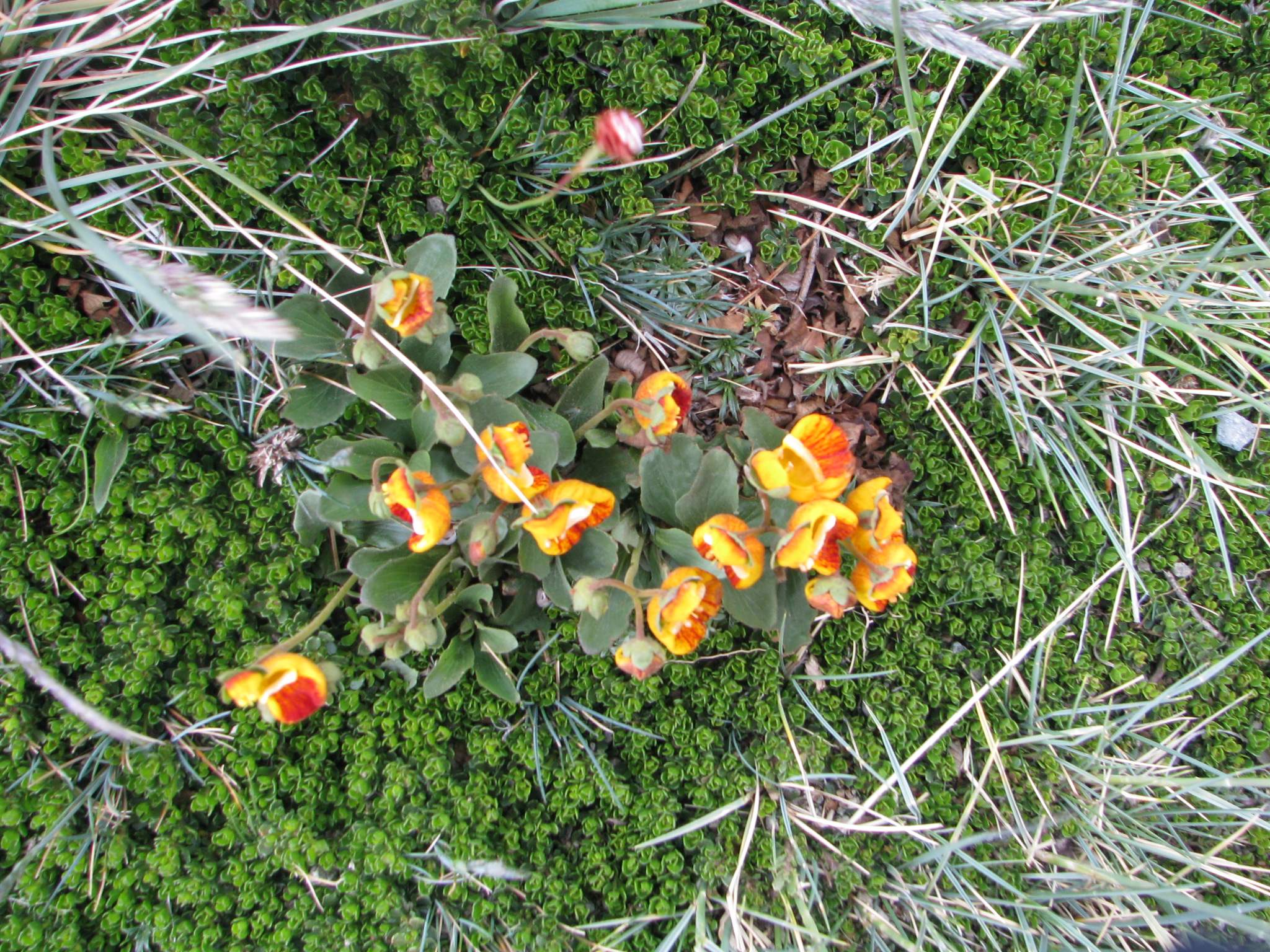 Dans les prairies ou les parties défrichées, le firebush (Embothrium coccineum), une Protéacée, flamboie au cours de ce printemps (à droite ci-dessous). Au sol, on peut admirer des tapis de Anemone multifida, anémone jaune blanc, (au centre) et une belle Scrophulariacée à feuille jaune (Calceolaria uniflora) (à gauche).