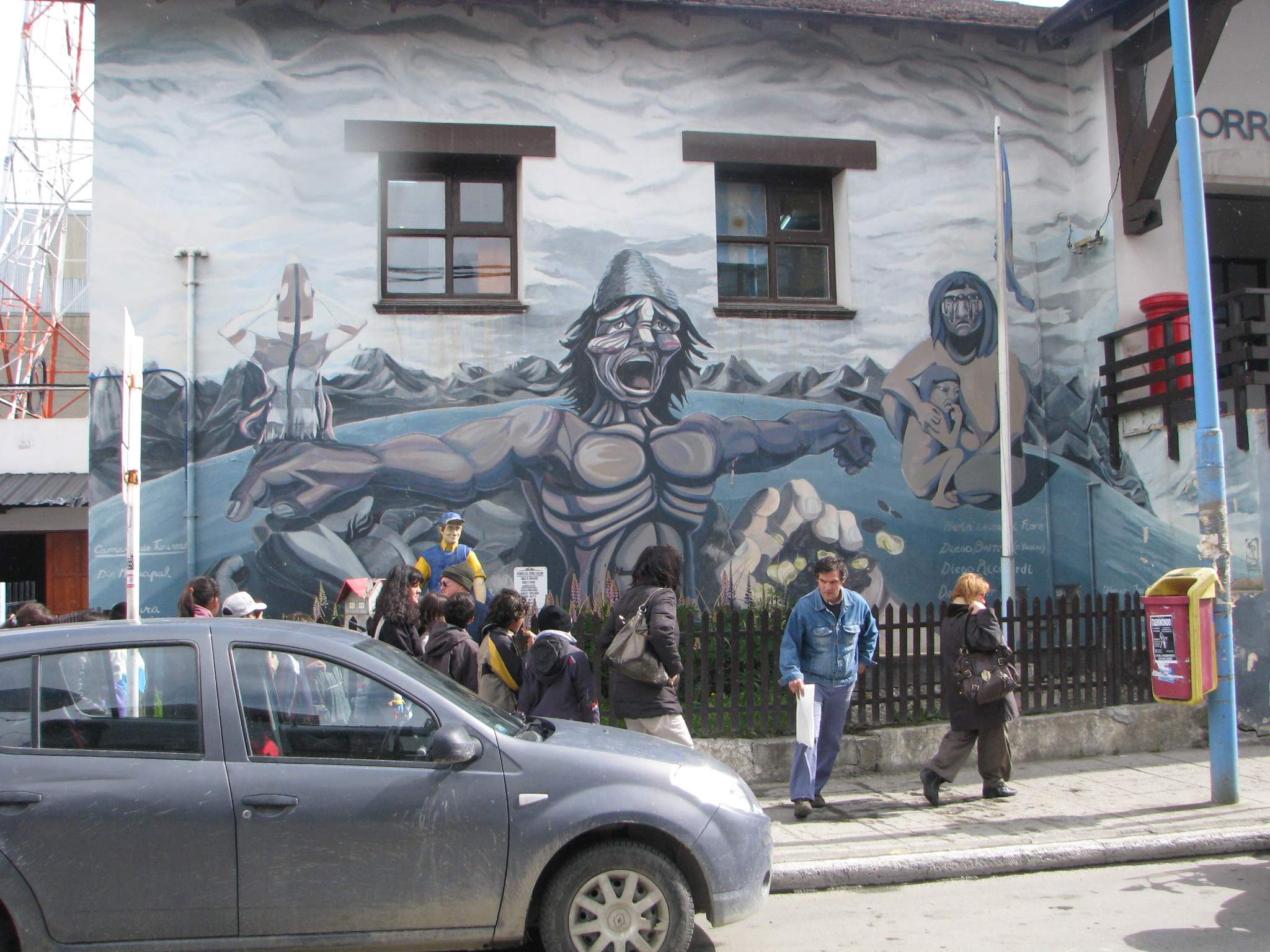 Le triste passé des Yamanas a été peint sur des murs de la ville, mais on y trouve aussi de nombreux dessins de l’oppression argentine moderne sur son peuple.