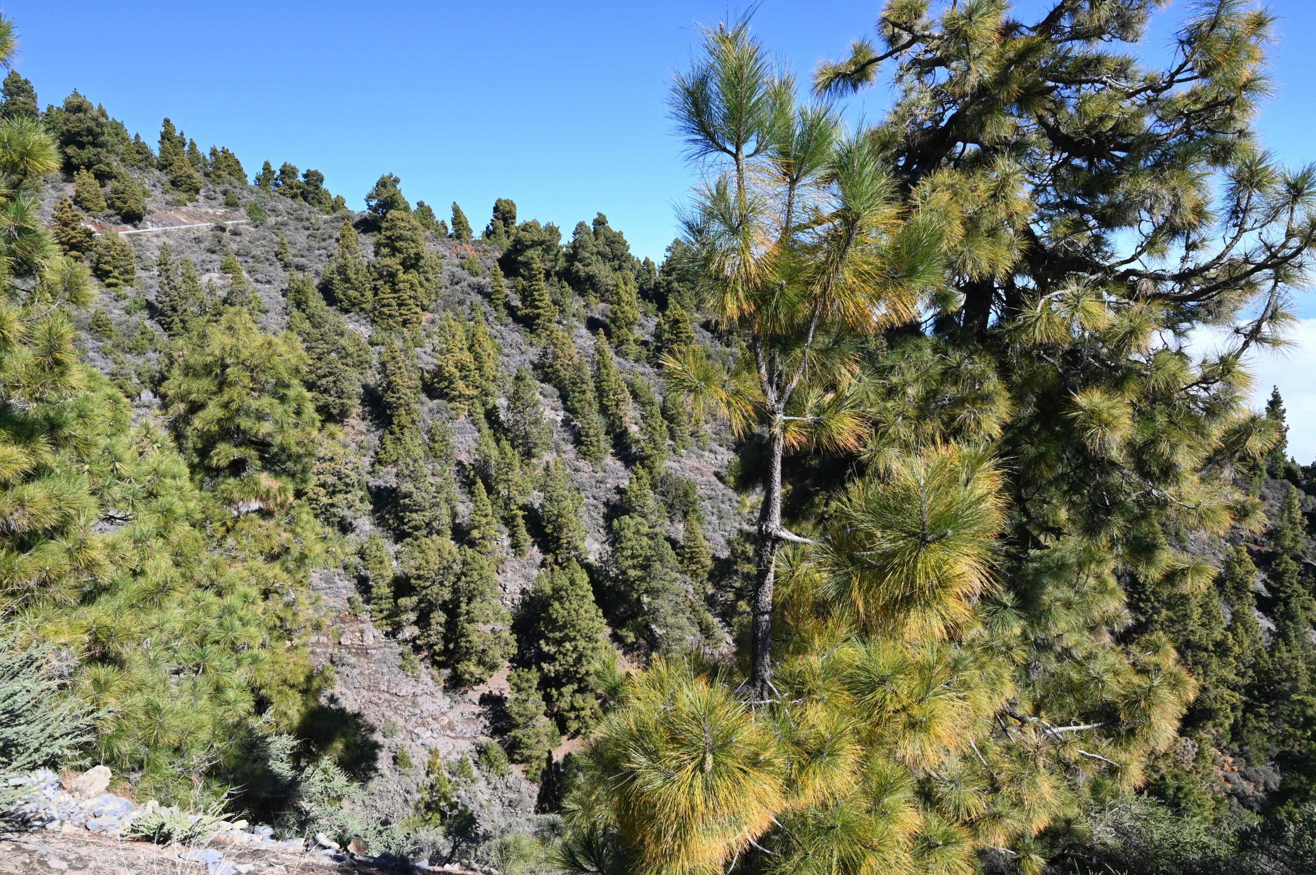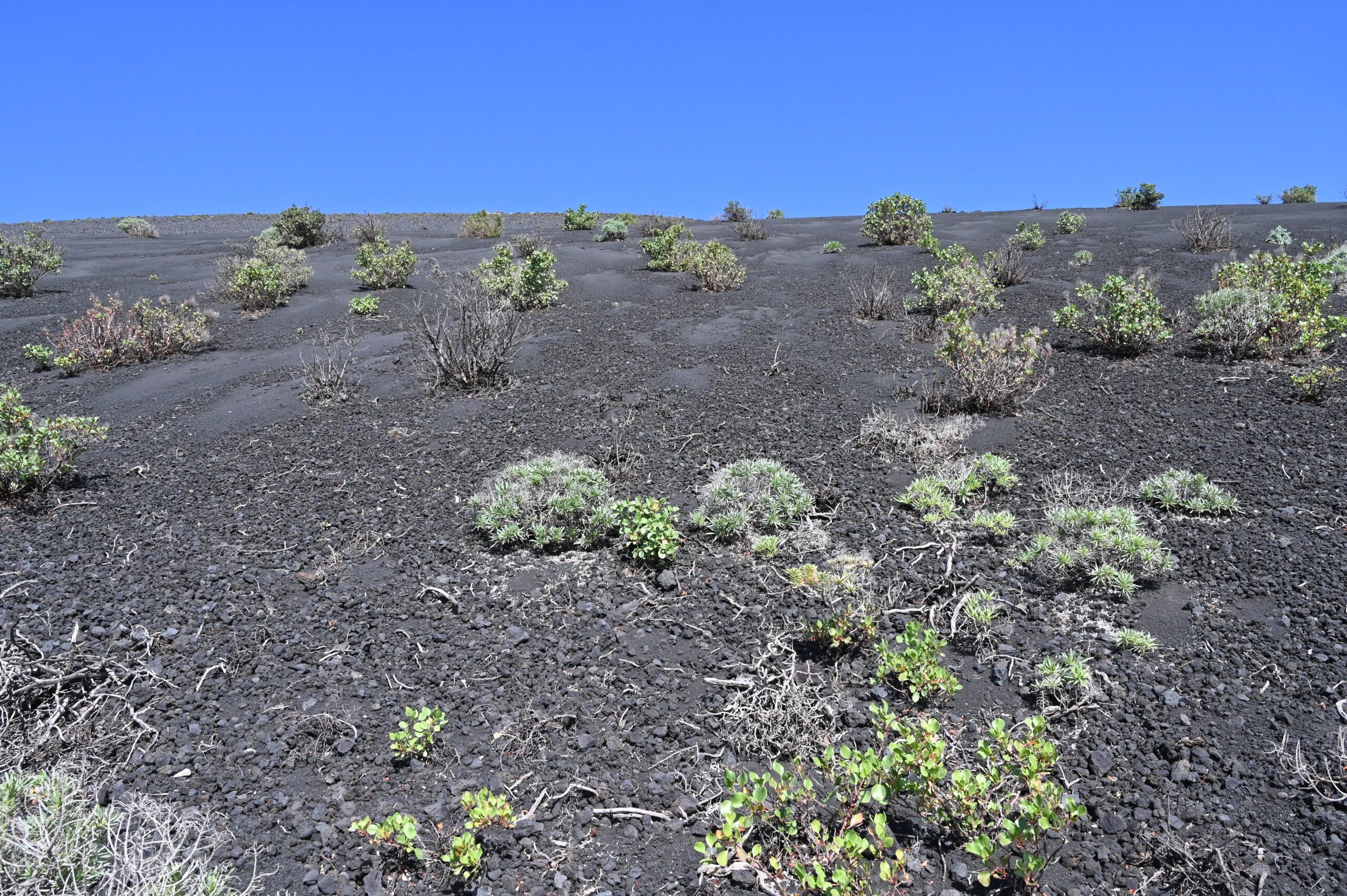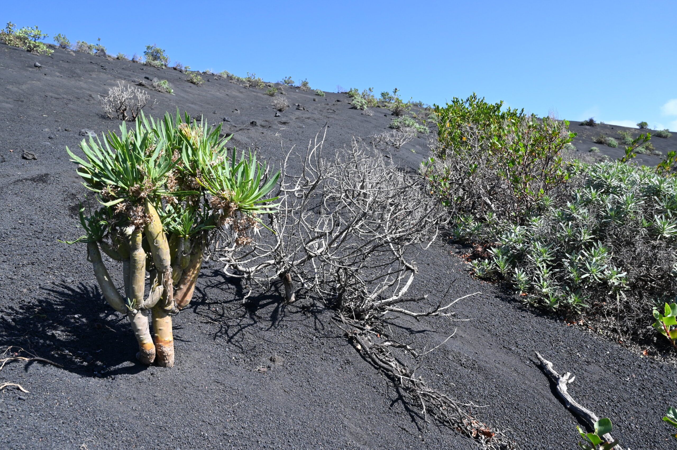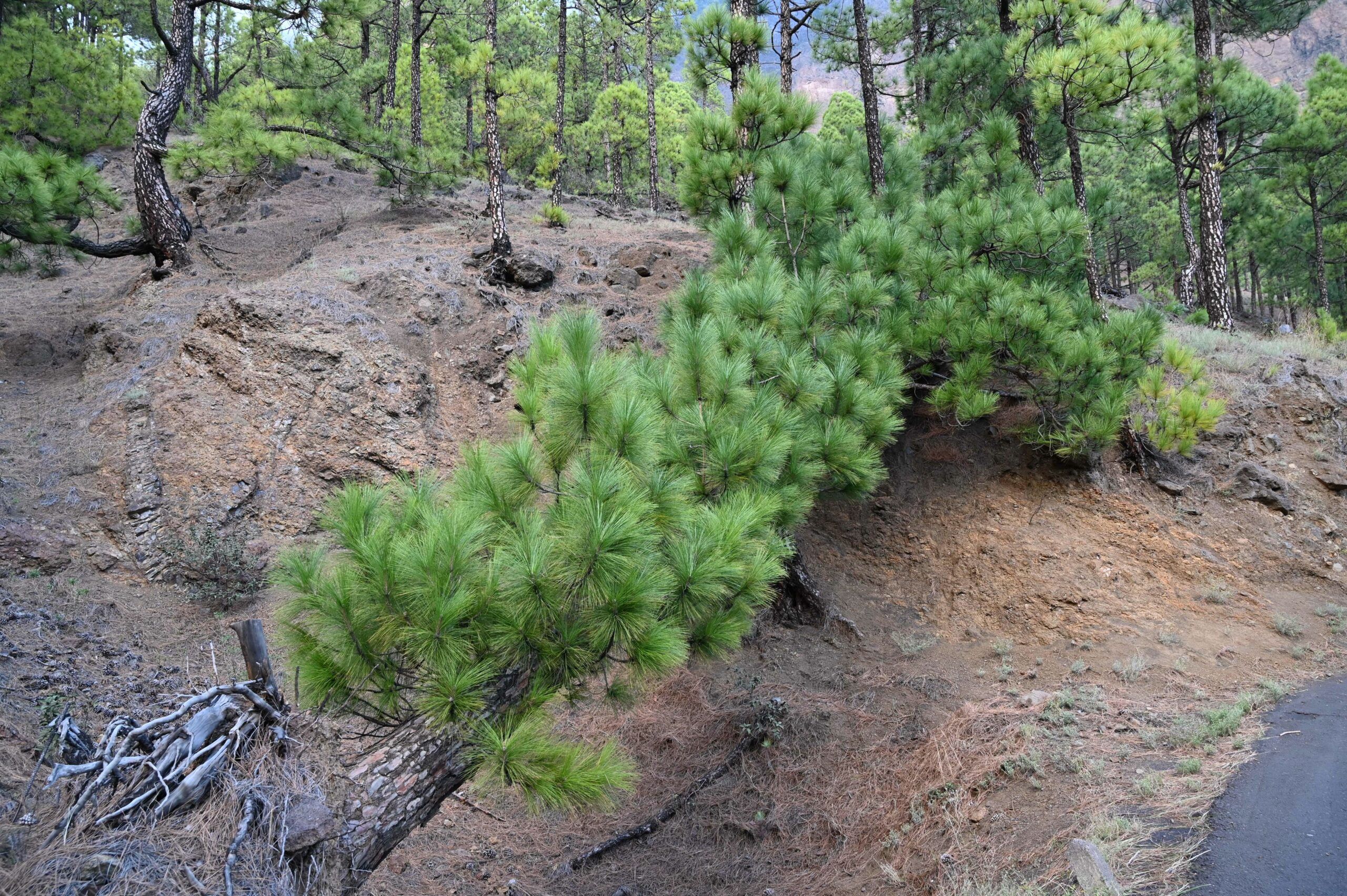 Le volcan San Antonio tout proche a en revanche des pentes presque totalement dénudées, malgré l’ancienneté de l’éruption (1677) ! La pente est trop forte, faite de lapillis. Il y a moins de 10 pins, et dont l’architecture montre la difficulté à vivre dans un tel milieu.
