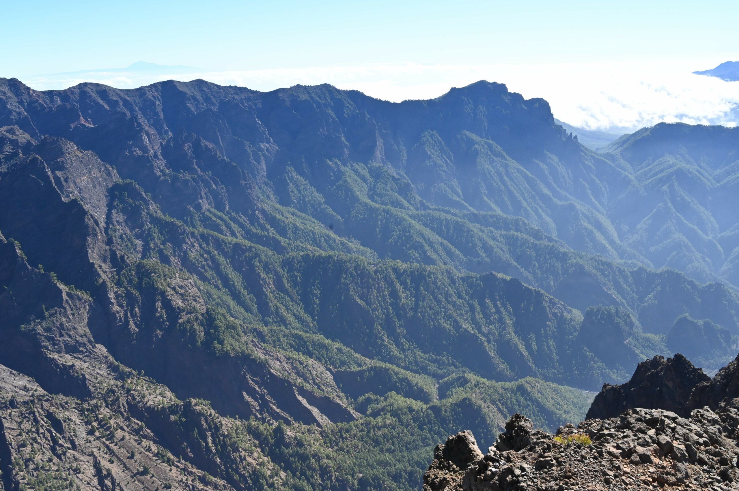 Le volcan fume toujours ! Par une superbe journée ensoleillée, nous montons vers la caldera de Taburiente. Il s’agit d’un stratovolcan effondré ouverte vers l’océan Atlantique, dont on voit nettement la morphologie sur la photo ci-dessous. L’un des rebords de la caldeira s’appelle le Roque de los Muchachos. C’est le point culminant de la Palma ( 2428m).