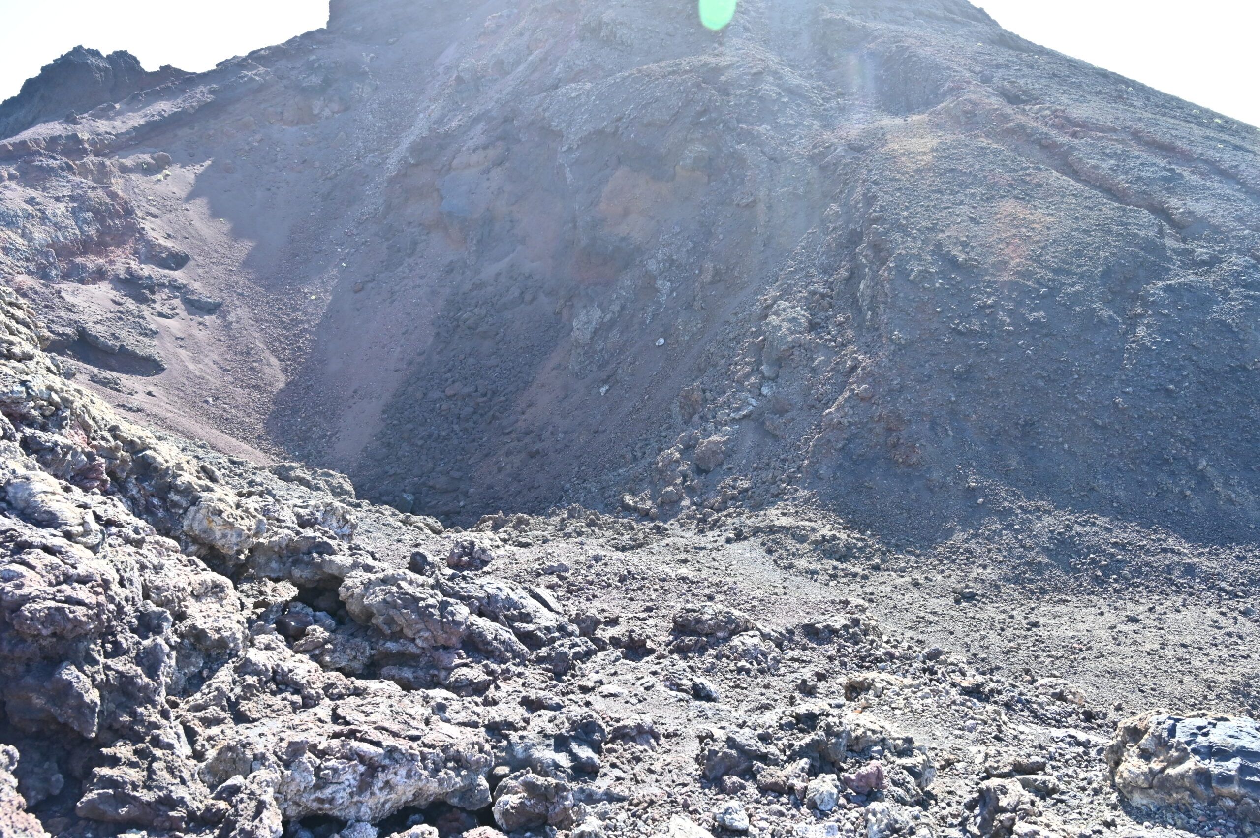 La vue à l’intérieur du volcan est impressionnante avec ses parois à pic. Au loin, on voit le panache de fumée de Cumbre vieja, sous forme de minuscule point noir au-dessus des derniers nuages à l’horizon.