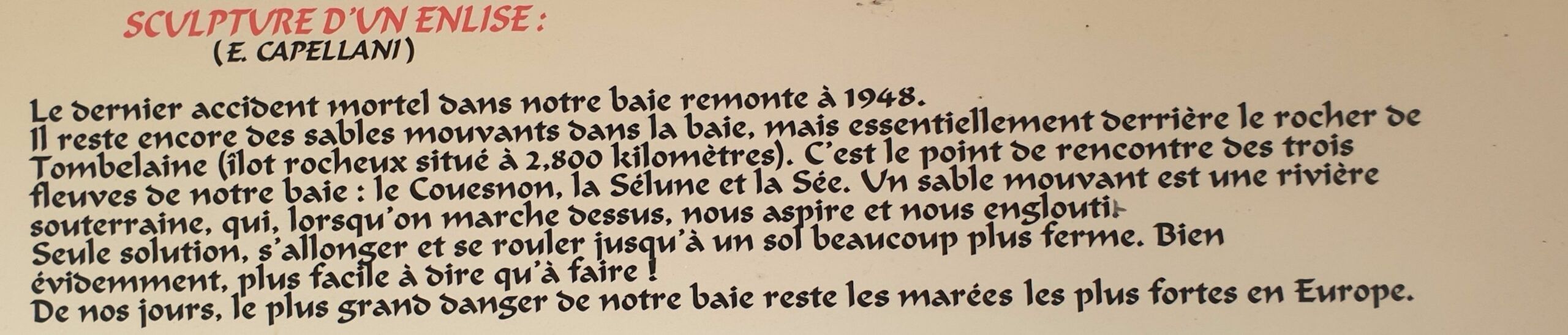 La baie reste dangereuse pour les imprudents.Le dernier noyé dans la vase remonte à 1948 et est représenté au musée du Mont St Michel. Mais tous les ans, parait il, des personnes sont secourues par l’hélicoptère lors de la marée montante.